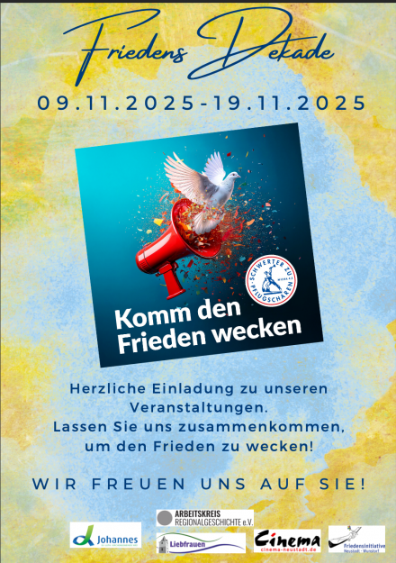 Frieden ist keine Selbstverständlichkeit – aber er fängt genau da an, wo Menschen sich bewegen. Vom 9. bis 19. November steht Neustadt im Zeichen der FriedensDekade. Unter dem Motto „Komm den Frieden wecken“ laden die Kirchengemeinden Johannes und Liebfrauen gemeinsam mit Initiativen zu Gottesdiensten, Aktionen, Musik und Gesprächsrunden ein.