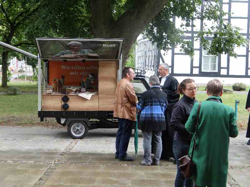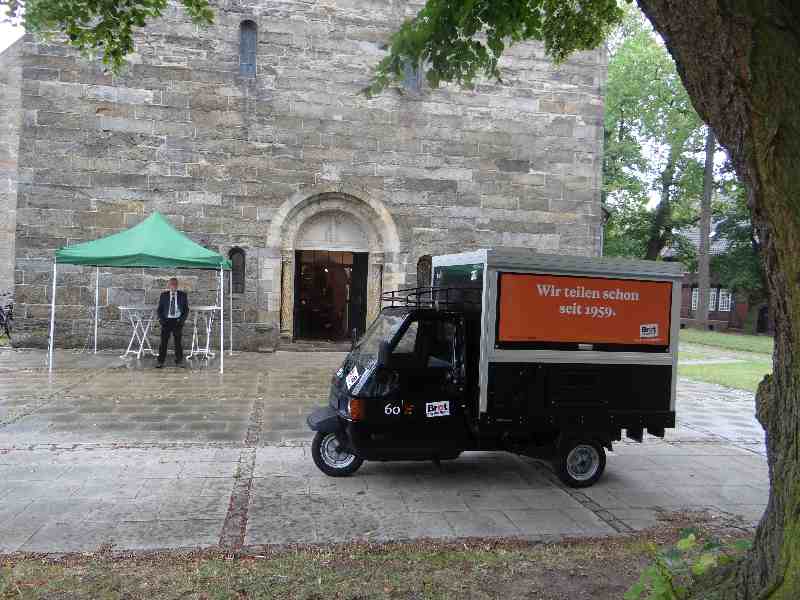Nach dem Gottesdienst schauten sich die Menschen das Brot-Dreirad an, mit dem auf das anhaltende Engagement von „Brot für die Welt“ für die Hilfe für Menschen in Hungersnot und mehr Gerechtigkeit hingewiesen wird. Das Team aus Hannover tourt vom 25. Juni bis 23. August durch die 48 Kirchenkreise der Landeskirche Hannovers. Uwe Becker, Beauftragter der Landeskirche Hannovers für „Brot für die Welt“ erzählte, dass sie bisher „viel Unterstützung auf ihrer Tour bekommen haben“ und „die Menschen sich über die Aktion mit der Ape freuen“.