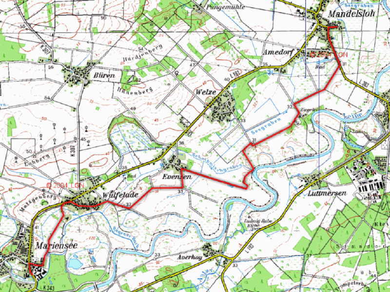 Diesem Weg folgt man, ohne abzubiegen, bis nach Wulfelade zur Straße „Klostermühle“, ein weiteres Mal Hinweis auf geschichtliche Ursprünge; an der „Wulfelader Straße“ rechts abbiegen und einige Meter danach wiederum rechts in die Dorfstraße und dem „Moritzgraben“ folgen. Einige prächtige Fachwerkhäuser säumen den Weg. Man folge den Kennzeichnungen des Radwanderweges Leinetal Er führt an den Ortschaften Evensen, Welze, Amedorf vorbei.