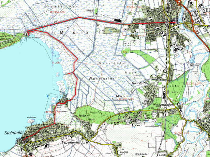 Man kann zwei sehr unterschiedliche Wegrouten wählen. Eine verläuft im Niederungs- und Hochmoorbereich des Steinhuder Meeres, die etwa der doppelten Weglänge zur zweiten Variante entspricht. Der andere Wandervorschlag führt über den Geestrücken nach Neustadt entlang kultivierter Äcker und trockengelegter Wiesen des Toten Moores an der Ortschaft Poggenhagen/Moordorf vorbei.