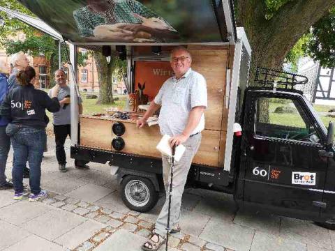Danke sagen wollte das evangelische Hilfswerk und kam mit einem italienische Kleinlieferwagen, einer sogenannten Ape, zum runden Geburtstag von „Brot für die Welt“ nach Wunstorf. Gemeinsam wollte „Brot für die Welt“ mit seinen Unterstützerinnen und Unterstützern vor Ort den 60. Geburtstag feiern. Dabei steht das Wort „Brot“ nicht nur für Brot, sondern für all das, was zum Leben notwendig ist und gerecht verteilt sein sollte.
