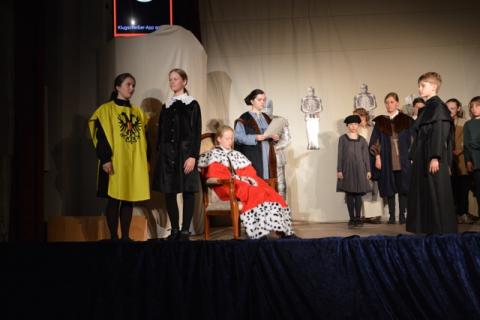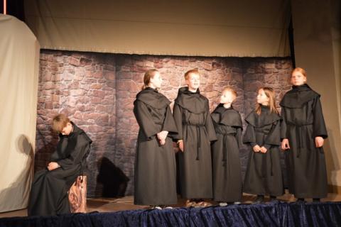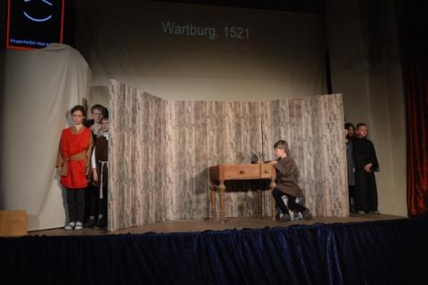 Für die Uraufführung haben die Eltern der Kinder kräftig mitgeholfen: beim Bühnenbild mit Kulissen, die mittelalterliche Straßen oder die Wartburgstube zeigen; beim Nähen der Kostüme oder beim Bühnenaufbau. Ein Lichtmeister verwandelte die alte Liebfrauenkirche in ein Theater. Feuerwehr und Ehrenamtliche haben alle Fenster der Kirche mit schwarzer Folie abgeklebt.