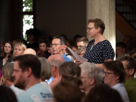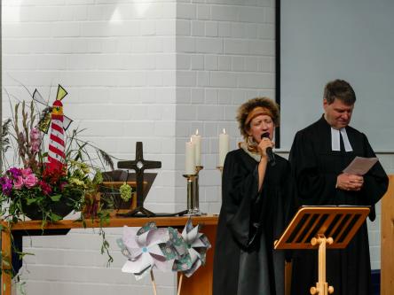 Nach dem Familiengottesdienst am Sonntag und der ausgiebigen Möglichkeit zum Austausch und Spiel in Gemeindehaus und Kirchgarten gab es ab 14 Uhr für die Besucherinnen und Besucher in der Johanneskirche die Möglichkeit zu einer ganz persönlichen Zeitreise: Nach den Grußworten wurde bei einem Talk mit ehemaligen Pastorinnen und Pastoren und anderen Hauptamtlichen auf ganz verschiedene Episoden aus der Geschichte der Johannesgemeinde zurückgeblickt. Den musikalischen Rahmen um die vielen Geschichten und Anekdoten bildeten die Sängerinnen und Sänger vom Gospelchor Kumbayah.