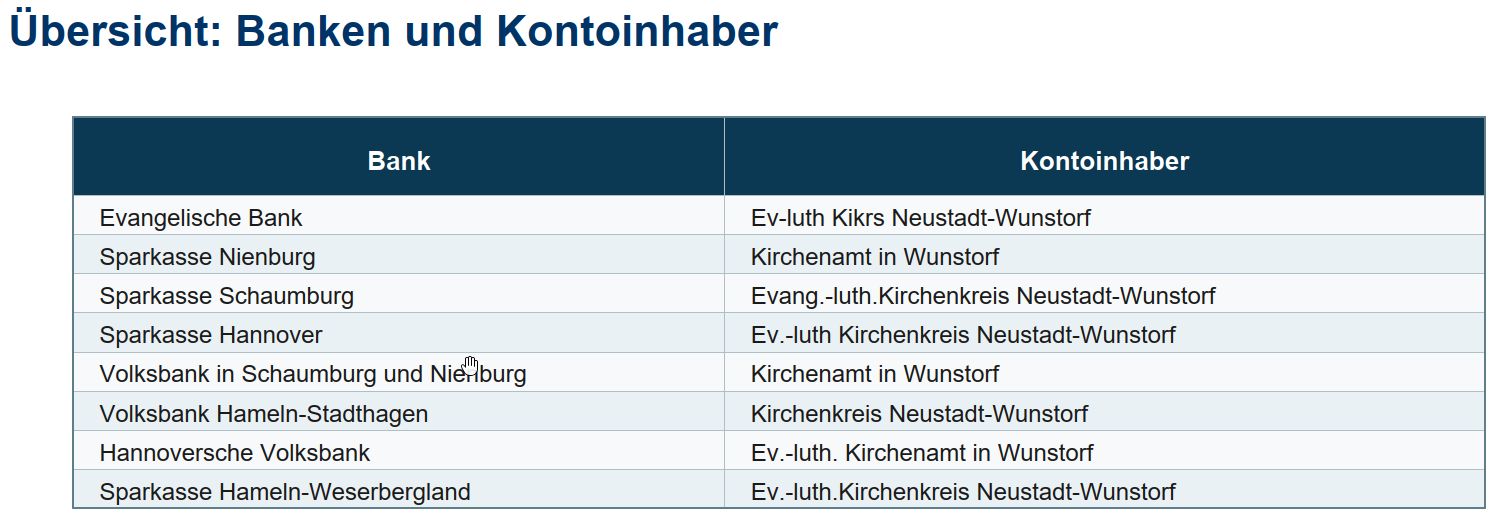 Ab 2025 wird beim Überweisen darauf hingewiesen, wenn der angegebene Kontoinhaber nicht exakt mit dem bei der Bank genannten übereinstimmt. Da unser Konto über den Kirchenkreis läuft und dieser verschiedene Konten mit verschiedenen Namen nutzt, kommt es gerade zu vielen Fehlermeldungen. Die korrekten Kontoinhaber sind: