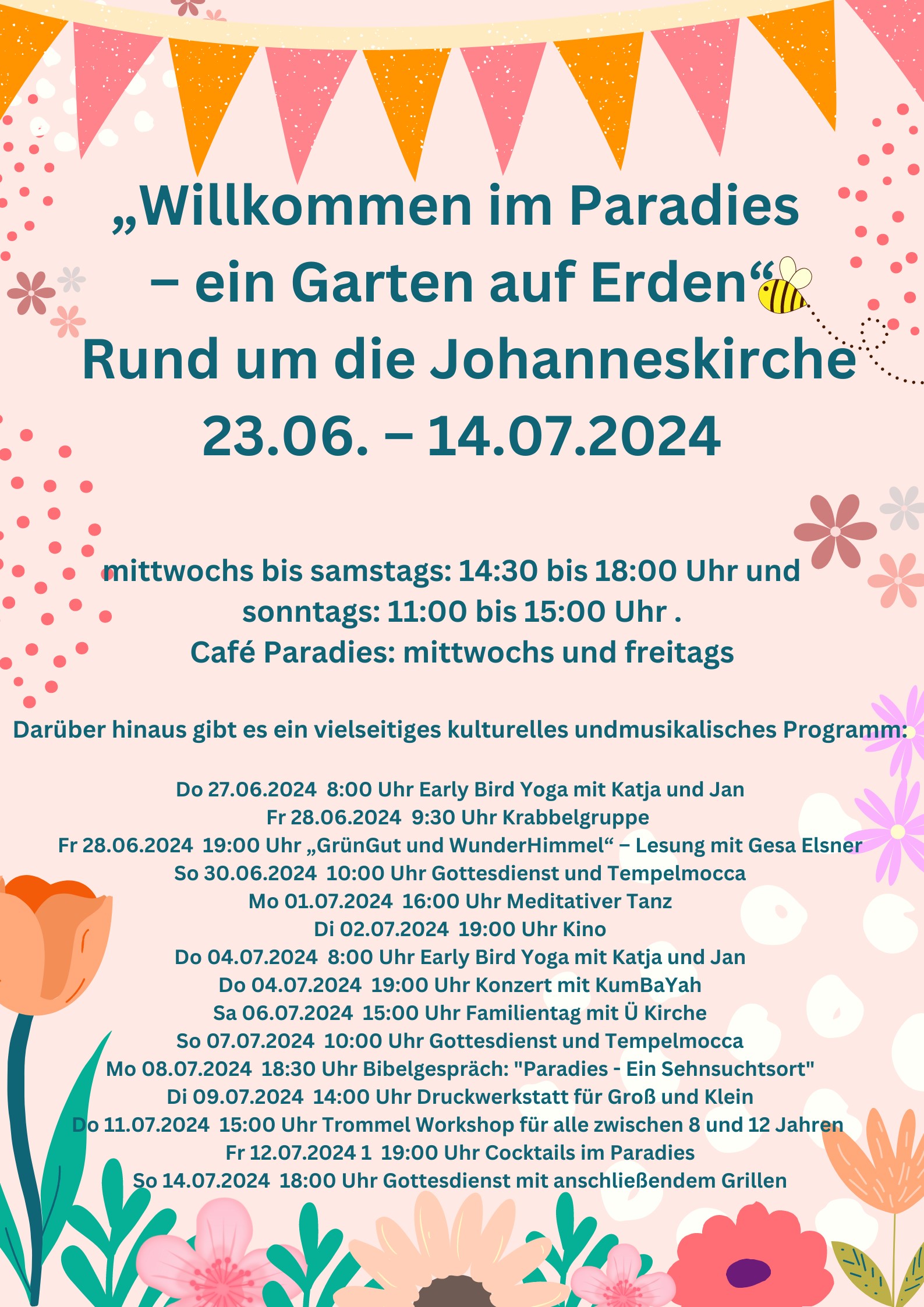 Jetzt ist es soweit: Rund um die ev. Johannes Kirche wird es paradiesisch. Vom 23.06. bis zum 14.07. sind im Garten der Kirchengemeinde Stationen zum „Paradies“ aufgebaut. Alle – „Jung und Alt“ - sind mittwochs bis samstags von 14:30 bis 18:00 Uhr und sonntags nach dem Gottesdienst bis 15:00 Uhr zum Verweilen eingeladen; mittwochs und freitags öffnet das Café Paradies.